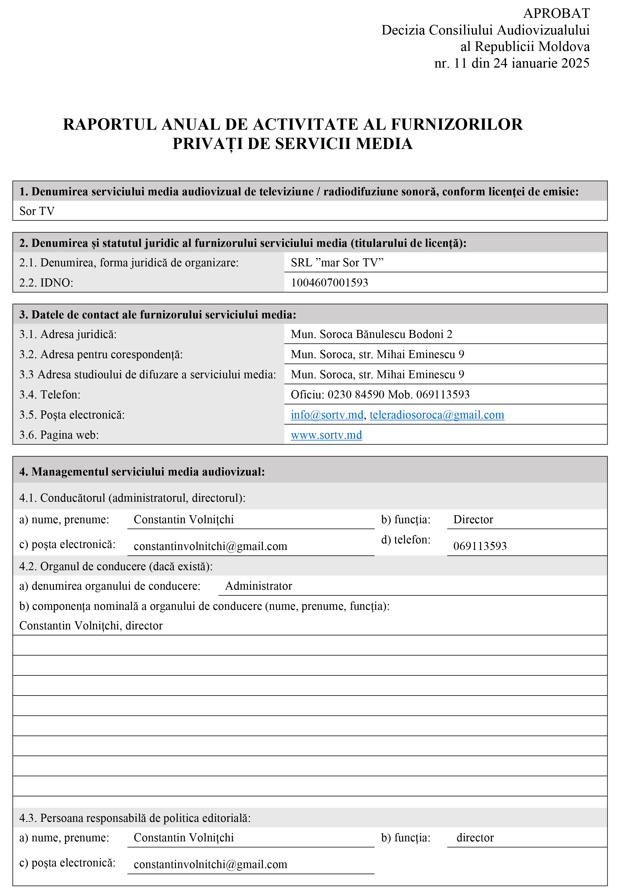 Acest website (www.sortv.md), denumit în continuare „site,” este administrat de SRL „Mar Sor TV”, IDNO 1004607001593, cu sediul în Republica Moldova, municipiul Soroca, str. Mihai Eminescu 9/3. Accesarea acestui site și utilizarea lui și a website-urilor conexe presupun acceptarea următorilor termeni și condiții.