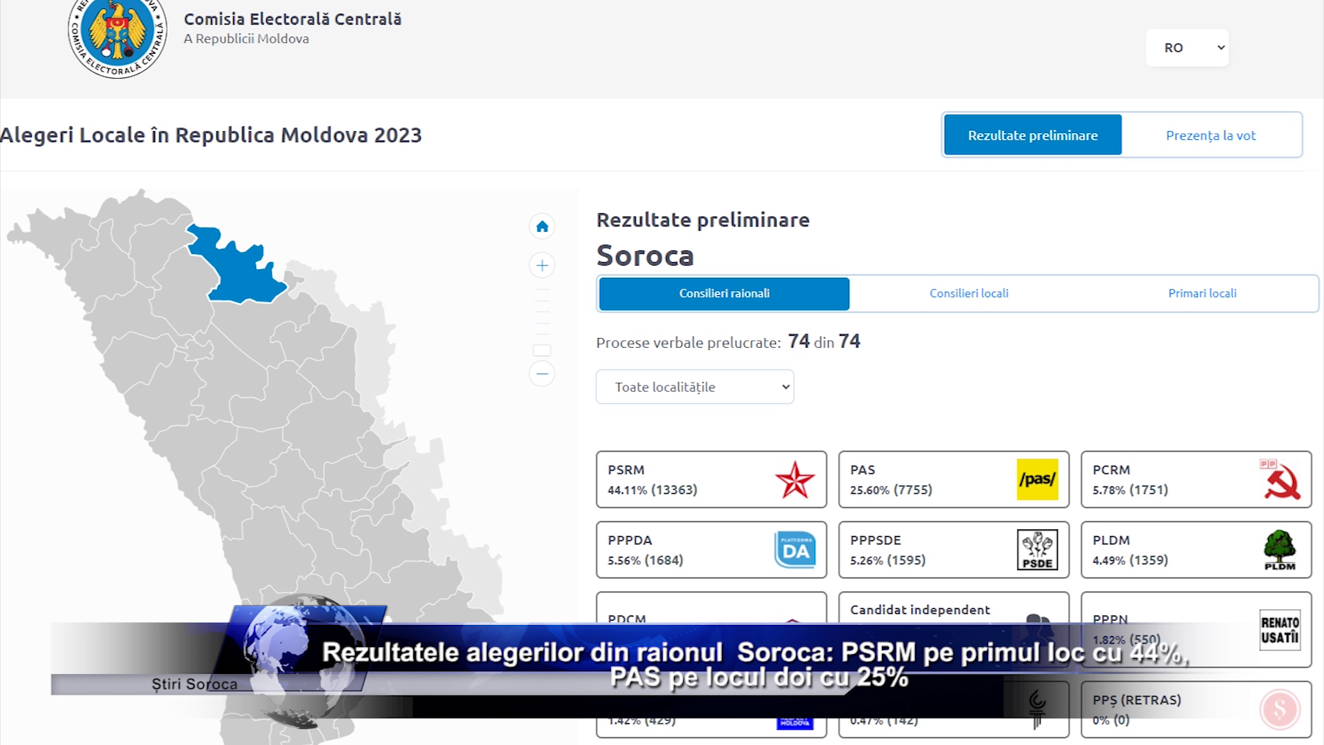 Soroca, 6 noiembrie 2023 - După prelucrarea majorității proceselor verbale ale alegerilor locale din Soroca, s-au stabilit rezultatele provizorii ale scrutinului. Partidul Socialiștilor din Republica Moldova (PSRM) a obținut cel mai mare procent de voturi, clasându-se pe primul loc, în timp ce Partidul Acțiune și Solidaritate (PAS) a ocupat locul doi.