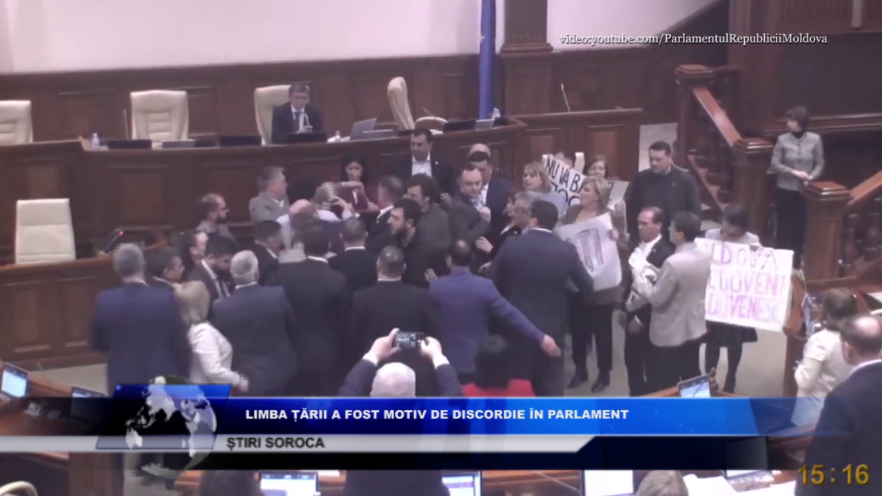 Limba ţării, a fost motiv de discordie în Parlament. Inițiativa deputaților PAS pentru substituirea în textul legilor Republicii Moldova și în Constituție a sintagmei „limba moldovenească” cu sintagma „limba română” a încins spiritele la ședință. Deputații Blocul Comuniștilor și Socialiștilor au venit cu postere și au blocat tribuna Legislativului în semn de protest. Mai mulți deputați s-au îmbrâncit. Blocul Comuniștilor și Socialiștilor au cerut alegeri anticipate. Cu o replica a venit președintele Parlamentului, Igor Grosu.