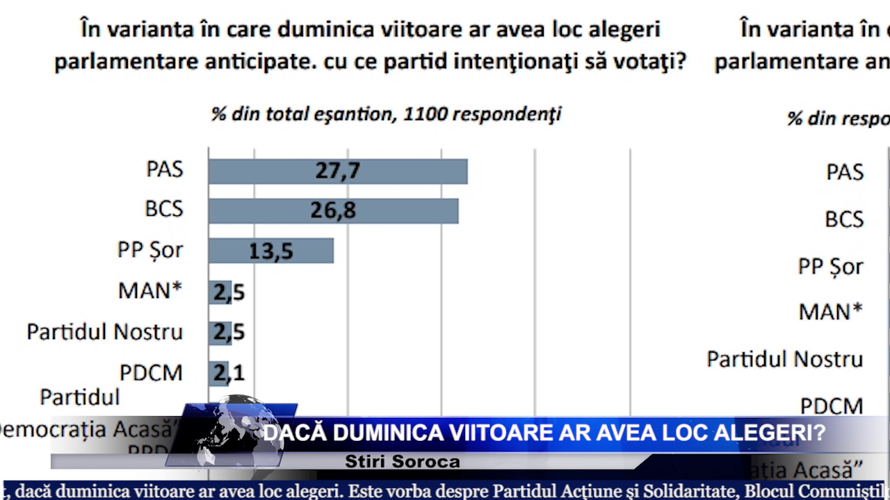 Partidul Acțiune şi Solidaritate ar acumula 27,7%. Pentru Blocul Comuniștilor şi Socialiștilor ar vota 26,8% dintre cei chestionați, iar pentru Partidul "ŞOR" - 13,5 procente. Cu o mare diferență urmează Mișcarea Alternativă Națională, anunțată de primarul Capitalei Ion Ceban. Aceasta ar acumula însă doar 2,5 la sută din sufragii, un număr insuficient de voturi pentru a ajunge în legislativ. În același timp, 7,5% dintre participanții la sondaj au spus că nu ar vota la aceste alegeri, iar puține peste 12 procente nu au opțiuni politice.