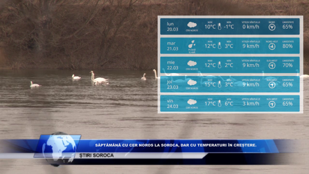 La Soroca toată săptămâna vom avea cer noros, iar marți și sâmbătă sunt prognozate ploi slabe. Vântul va bate cu maxim 9 kilometri la oră, în mare parte din direcția sud-vest.