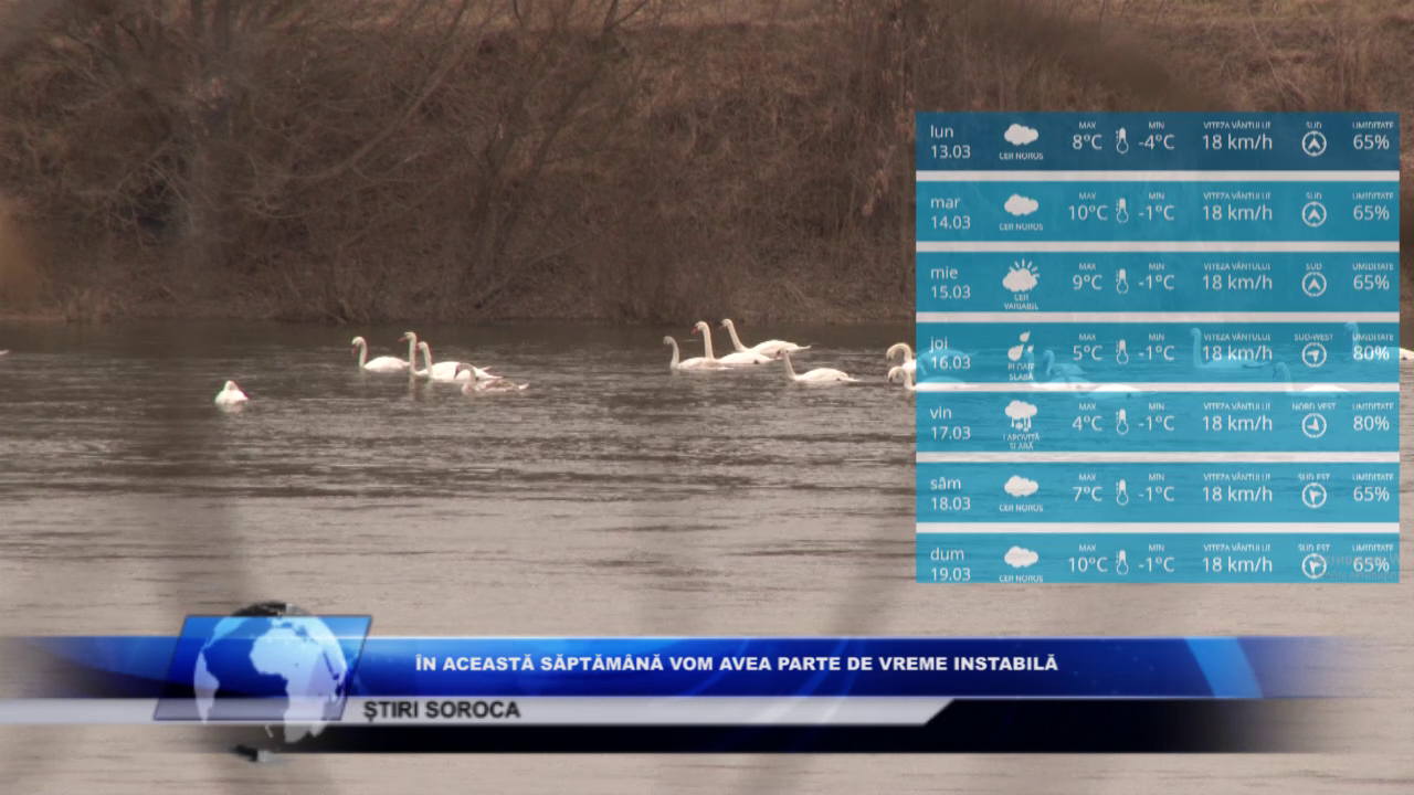 Meteorologii anunță pentru această săptămână o vreme instabilă cu cer noros, lapoviță și ploi de scurtă durată pe alocuri. Temperatura va varia cu maxime vor fi cuprinse între +8 și +10 grade și minime ce vor varia între -1 și -4 grade Celsius. Cerul va fi variabil, iar presiunea atmosferică va fi normală, anunță SHS.