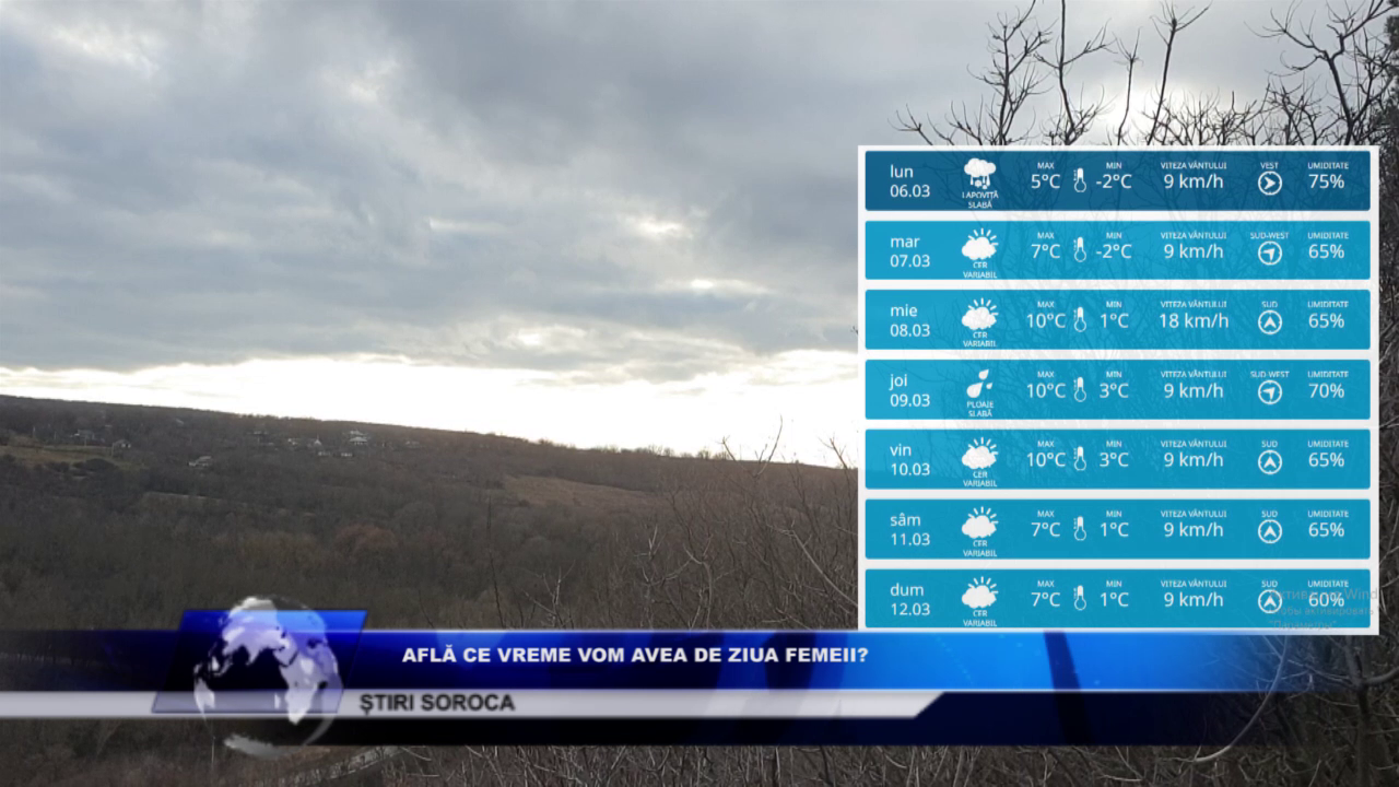 Marți și miercuri, vremea se încălzește ușor la Soroca, iar cerul rămâne noros. Termometrele vor indica între +7…+10 grade ziua și +1 grad …-2 grade, noaptea.