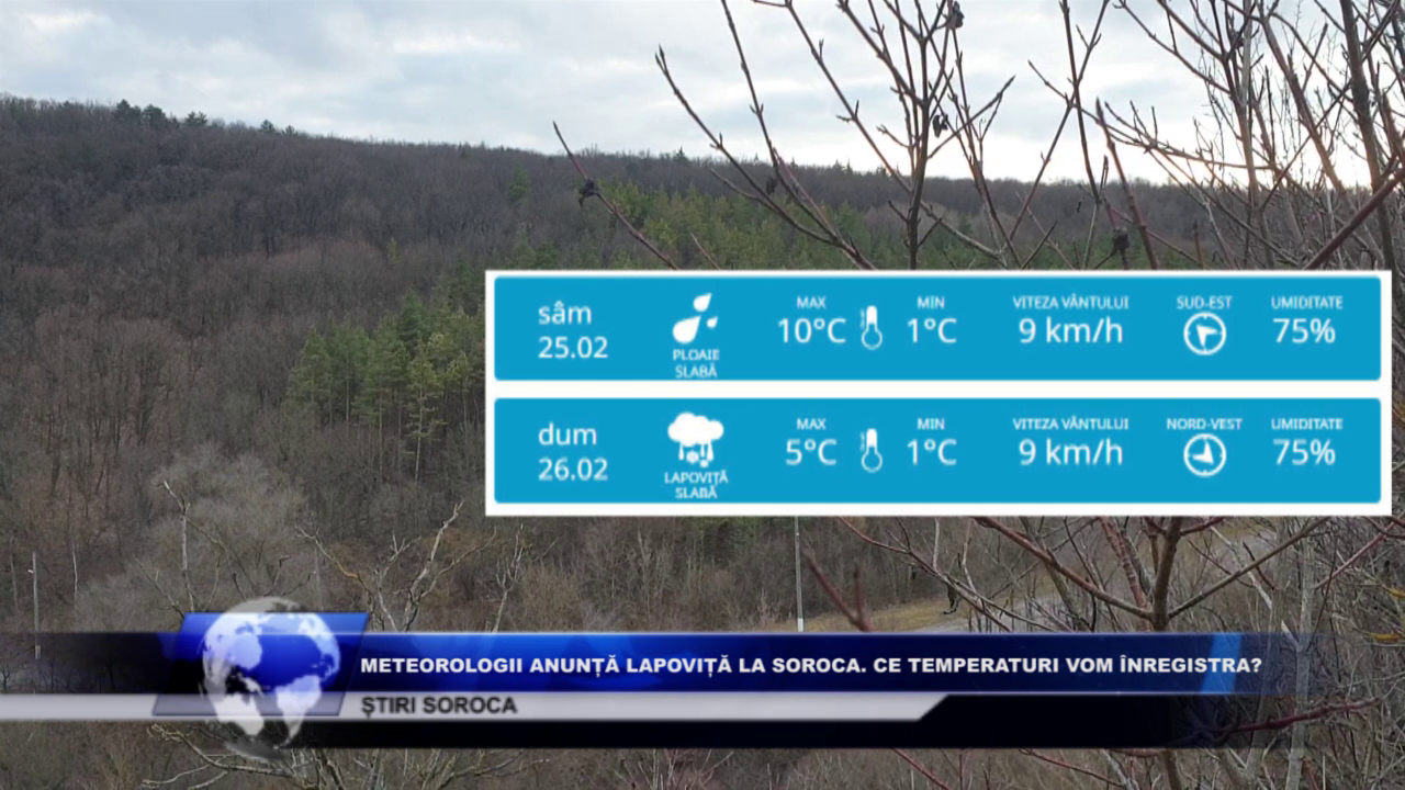 Pentru sâmbătă și duminică, meteorologii anunță la Soroca, lapoviță slabă, iar temperaturile vor oscila între +5…+10 grade. Noaptea vom înregistra +1 grad.