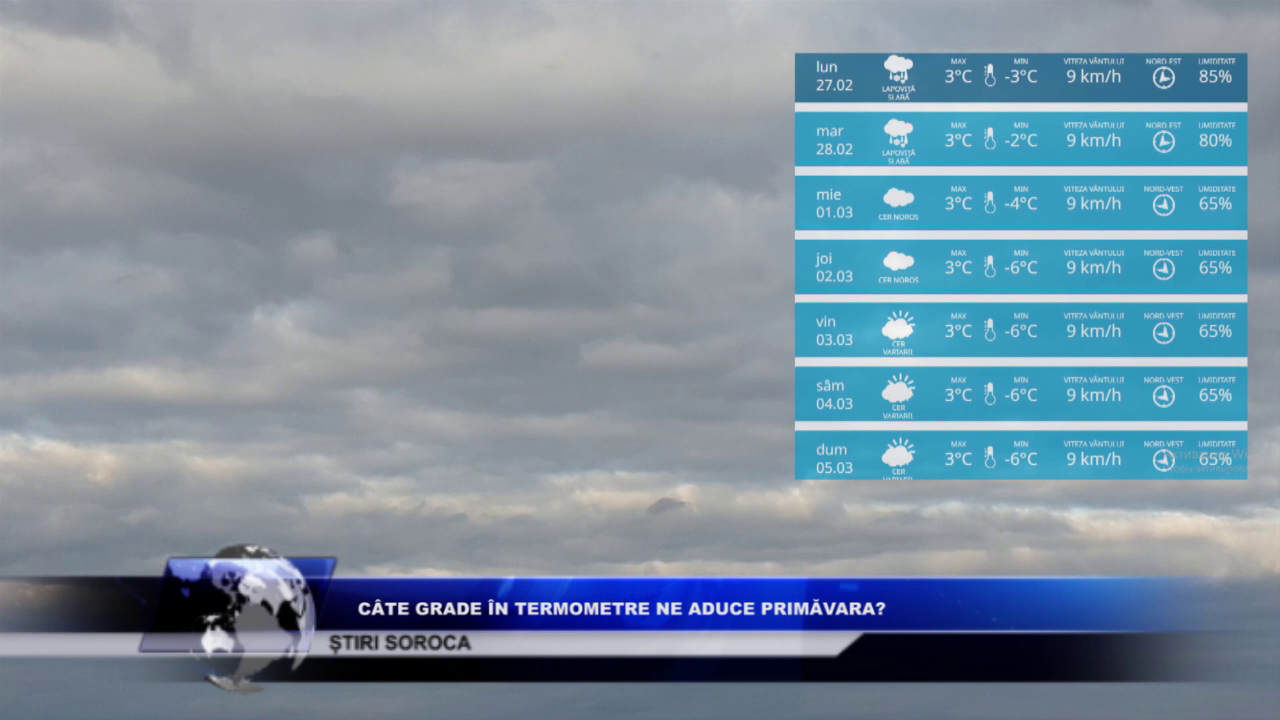 La Soroca, luni, marți și miercuri minimele coboară până la -3 -4 grade, iar maximele sunt de +3 grade ziua, joi și vineri vremea se răcește pe timp de noapte, astfel minimele vor coborî până la – 6 grade, iar ziua se va menține aceeași temperatură de +3 grade C.