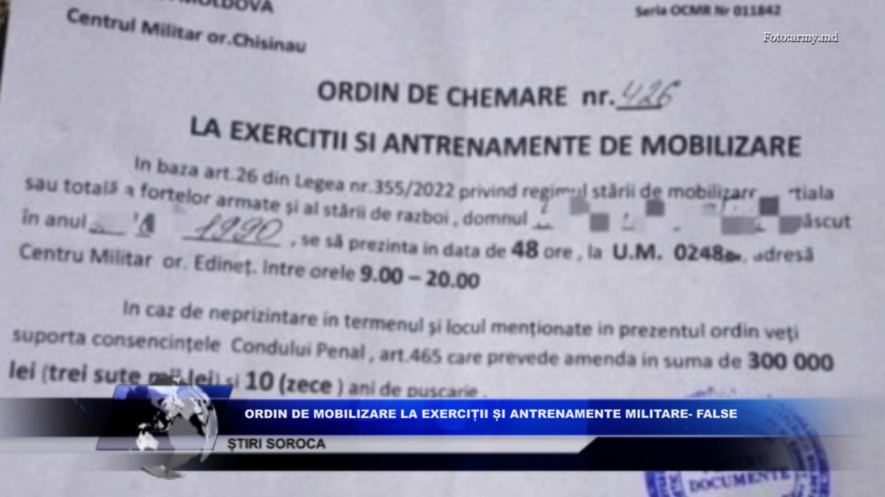În spațiul online se difuzează repetat informații false cu privire la expedierea în adresa cetățenilor Republicii Moldova a ordinelor de chemare la exerciții și antrenamente de mobilizare. În acest context, Ministerul Apărării atenționează societatea să nu cadă pradă dezinformărilor și manipulărilor.