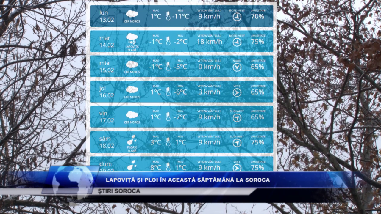 La Soroca, luni, 13 februarie, noaptea termometrele vor înregistra -11 C, iar ziua +1 C. Pentru ziua de marți vom avea valori de -2 grade noaptea, iar ziua vor fi minime de -1 grad C, în această zi se anunță lapoviță slabă. Începând cu ziua de miercuri vom avea ziua -1 +1 grad C, iar noaptea iar noaptea termometrele vor indica -5 .. -7 C. Sâmbătă și duminică se prevăd ploi slabe cu valori cuprinse între +3 +8 grade ziua și +1 noaptea.