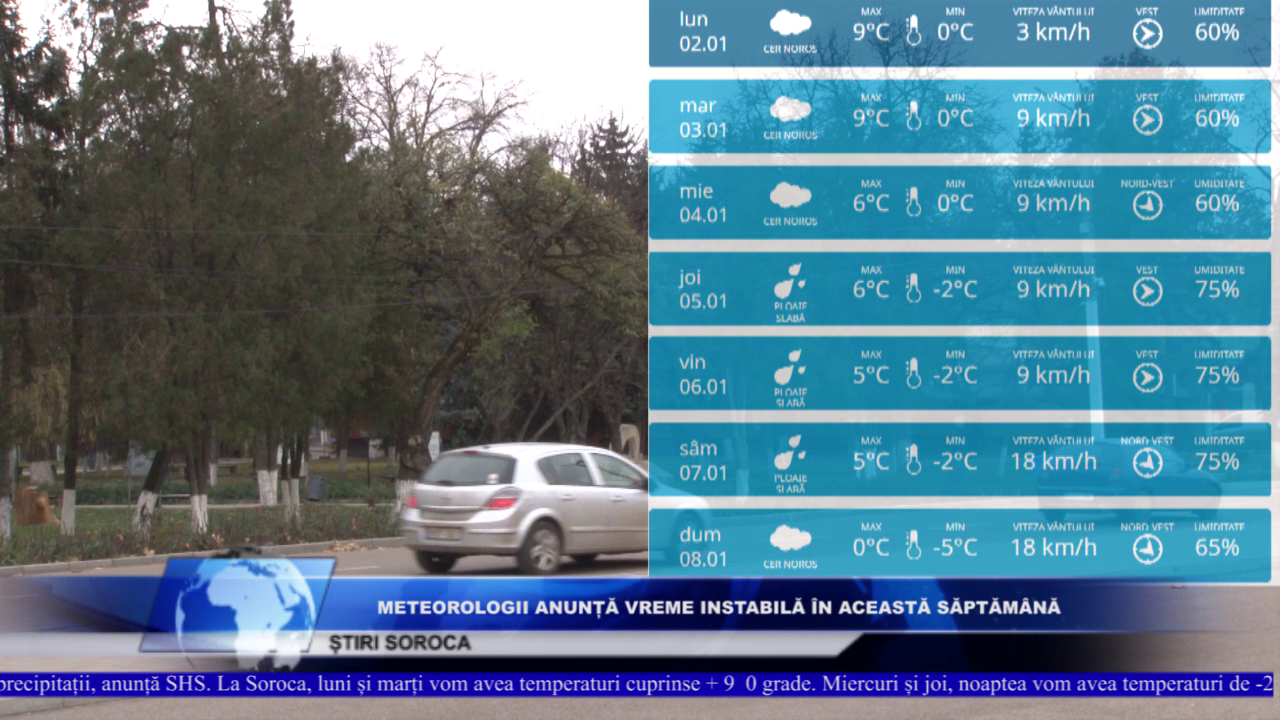 Cerul va fi variabil și vântul va sufla moderat, spre sfârșitul săptămânii se prevăd precipitații, anunță SHS. La Soroca, luni și marți vom avea temperaturi cuprinse + 9 0 grade. Miercuri și joi, noaptea vom avea temperaturi de -2 0 grade C, iar ziua mercurul din termometre va urca pînă la + 6 grade C. În zilele de odihnă vremea se răcește ușor, și vor cădea precipitați astfel,
