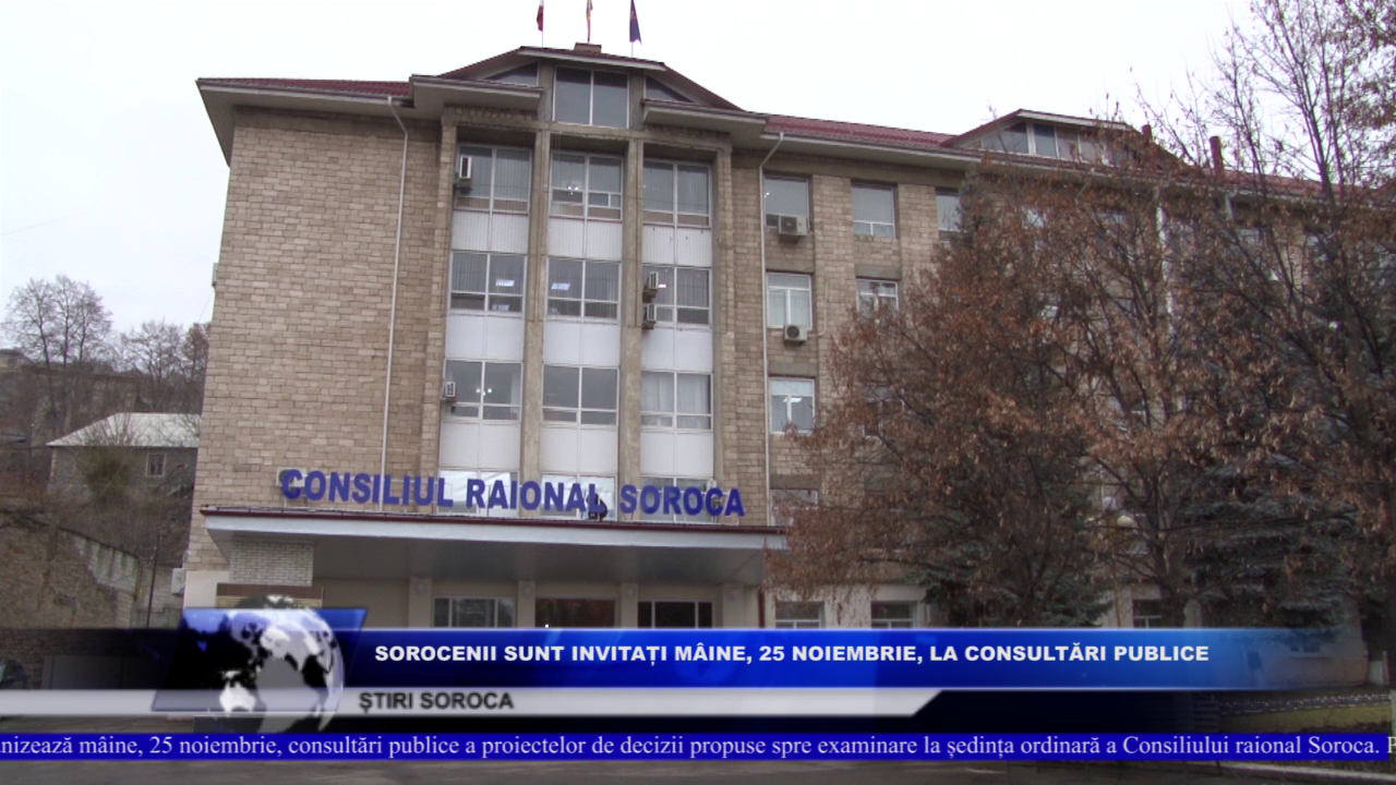 Consiliul raional Soroca organizează mâine, 25 noiembrie consultări publice a proiectelor de decizii propuse spre examinare la ședința ordinară a Consiliului raional Soroca. Potrivit Secretarului Consiliului Raional, Stela Zabrian, spre audieri sunt propuse cele mai importante subiecte și cele care prezintă interes pentru cetățeni.