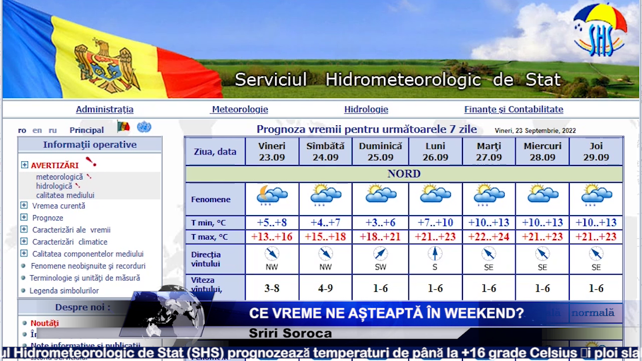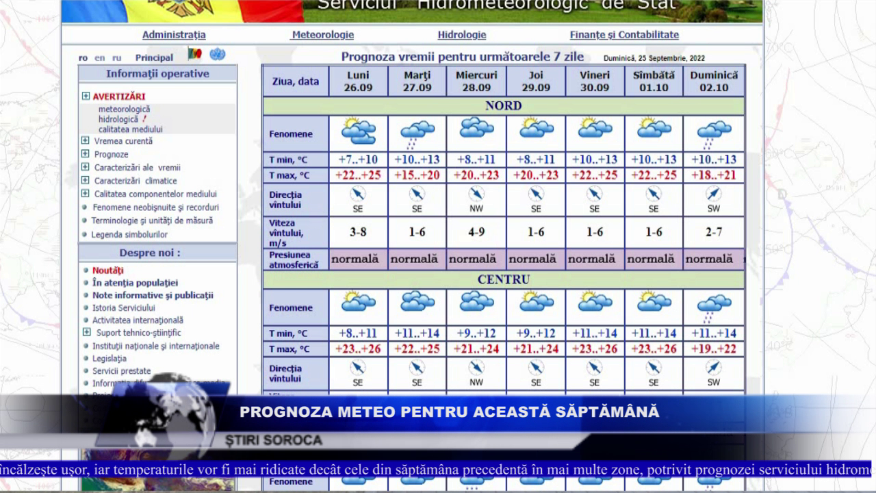 Pentru sâmbătă, 24 septembrie, Serviciul Hidrometeorologic de Stat (SHS) prognozează temperaturi de până la +16 grade Celsius și ploi slabe, la Soroca. Noaptea vom înregistra maxime de +5 grade C. Ploi slabe, vor cădea pe întreg teritoriul țării, iar presiunea atmosferică va fi normală.