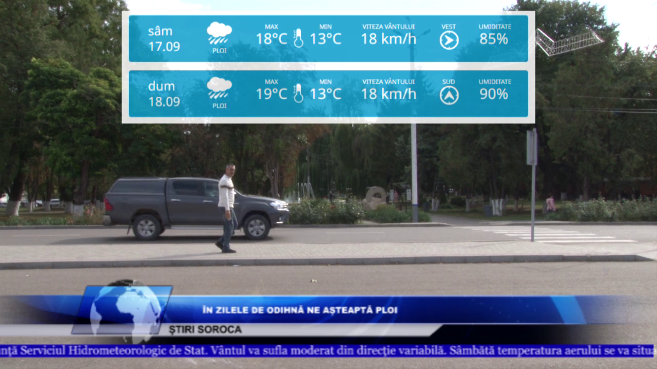 Următoarele zile de odihnă, 17-18 septembrie, se anunţă vreme instabilă cu ploi, pe alocuri de scurtă durată, anunţă Serviciul Hidrometeorologic de Stat. Vântul va sufla moderat din direcţie variabilă. Sâmbătă temperatura aerului se va situa între +13..+18ºC, iar duminică temperatura maximă a aerului se va menţine pe poziţii cu valori cuprinse între +13..+19°C.