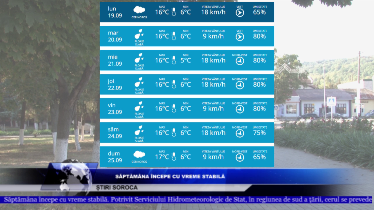 Luni, 19 septembrie, vom avea parte de cer variabil și temperaturi de până la +18 grade în nordul republicii, +19 grade în centru și cel mult +20 de grade în sud. Noaptea, temperaturile vor coborî până la +5 grade. Marți și miercuri, temperaturile vor oscila între +5 și +20 de grade Celsius. Joi și vineri, temperaturile vor ajunge la +20 de grade. Sâmbătă vom avea parte de ploaie și cer variabil la nord. În nordul republicii, vor fi între +5 și +18 grade, în centru se vor înregistra +6...+19 grade, iar în sud +7...+20 de grade Celsius. Duminică, vor fi cel mult +19 grade în nord, +20 în centru și +21 în sudul țării. Pe parcursul întregii săptămâni, presiunea atmosferică va fi normală.